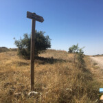 Llegamos a un cruce, seguiremos por un pequeño carril que nos sale a la izquierda y que desciende a un campo de labor y en menos de un kilómetro confluye con al camino del Val. Aquí una nueva flecha nos indica que podemos llegar a Yebra en unos 2 kilómetros. Para ir al Pinarejo cogeremos el carril de la izquierda y que ya toma dirección al cerro.