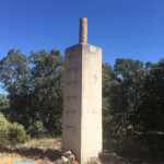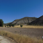 Llegamos a un cruce, nosotros seguiremos por el de la izquierda que se interna en unos campos labrados e iremos en busca de un poste de la luz que le tenemos enfrente y se encuentra junto al Camino del Tollo. El nuevo camino toma dirección Este; vamos por un carril que tiene servidumbre de paso. Al llegar al cruce veremos una flecha direccional que nos indica a Yebra por si queremos acortar nuestra ruta, estamos a unos 1,200 km del pueblo.