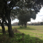 Fotografiamos una vieja fuente, seca, abandonada y sin agua y proseguimos nuestro camino dejando a la derecha una nave ganadera y poco después en un cruce seguimos por el camino de la izquierda, pues el de la derecha se interna en una finca. Con continuos vaivenes, subidas y bajadas proseguía nuestro camino. A ambos lados amplios campos cerealistas y en uno de ellos descubrimos un alfombrado campo verde y con un buen número de encinas que le daban un aspecto de “dehesa extremeña”, como muestra la foto que me ha cedido mi acompañante.