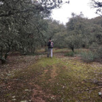 Cuando llegamos al arroyo de Valdeespeso y llevábamos unos tres kilómetros y medio, el camino principal gira a la izquierda para morir poco después en una amplia nava; aquí nos despistamos un poco pues es el punto donde comienza la senda que va paralela a un campo labrado y que el agricultor al arar la ha hecho desaparecer. Nos despistó también un rudimentario cerramiento del camino a base de bidones; tras cotejar el GPS dimos con el camino correcto. Caminamos por el borde del labrantío con un bosque de encinas a la izquierda. Al terminar la nava el sendero, muy buen marcado y definido, se interna en un bello encinar que nos sacó, algo más de un kilómetro después, de nuevo a otro labrantío.