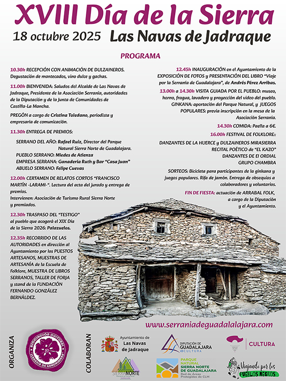 11.00h BIENVENIDA: Saludos del Alcalde de Las Navas de Jadraque, Presidente de la Asociación Serranía, autoridades de la Diputación y de la Junta de Comunidades de