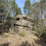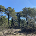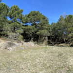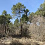 Seguimos caminando por el pinar y nos encontramos con una gran charca de agua que la bordearemos por la izquierda y a unos 100 metros el camino se ensancha haciendo un giro a la izquierda, seguiremos por él. Si nos fijamos, de frente vemos el AVE. Este nuevo camino nos lleva a un cruce, aquí volvemos a girar a la izquierda para continuar en dirección sur por un buen camino entre pinos y carrascas Hay algún cruce, pero siempre seguimos por el nuestro.