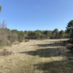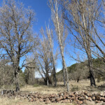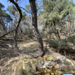 Continuaremos y veremos algunas edificaciones prácticamente en ruinas. Cuando llevemos como un kilómetro por el pinar, llegaremos a un descampado y a un cruce. Aquí deberemos de estar atentos a la señalización pues hay una flecha que nos indica el camino correcto a seguir, a la izquierda. Vamos por un buen carril en dirección sur.