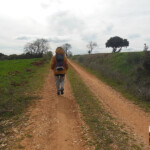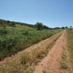 Nuestro camino va ascendiendo por una vaguada en un bosque con encinas, carrascas y jaras hasta que llega al monte, al llano. Aquí ya tenemos las vistas impresionantes de toda la sierra al fondo. Vamos a continuar por el monte tomando dirección norte, con campos de labor a ambos lados, hasta un cruce donde se nos une un carril que nos llega por la derecha. Haremos este giro brusco para continuar por este mismo carril ya en dirección sur por el que caminaremos cómodamente. El camino va perdiendo altura progresivamente, la que habíamos ganado anteriormente, hasta que lleguemos a un cruce, aproximadamente a unos 3,300 kms desde el giro que habíamos hecho. Aquí cogemos el carril de la derecha para seguir por un buen camino, hasta que en unos 300 metros desembocamos en una pista principal.
