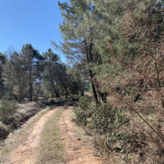 Seguimos caminando por el pinar y nos encontramos con una gran charca de agua que la bordearemos por la izquierda y a unos 100 metros el camino se ensancha haciendo un giro a la izquierda, seguiremos por él. Si nos fijamos, de frente vemos el AVE. Este nuevo camino nos lleva a un cruce, aquí volvemos a girar a la izquierda para continuar en dirección sur por un buen camino entre pinos y carrascas Hay algún cruce, pero siempre seguimos por el nuestro.