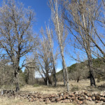 Continuaremos y veremos algunas edificaciones prácticamente en ruinas. Cuando llevemos como un kilómetro por el pinar, llegaremos a un descampado y a un cruce. Aquí deberemos de estar atentos a la señalización pues hay una flecha que nos indica el camino correcto a seguir, a la izquierda. Vamos por un buen carril en dirección sur.