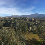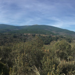 Caminamos por una cómoda pista, de vez en cuando vemos algún poste de señalización con marcas de pintura blanca y amarilla de los caminos ya indicados. La pista comienza a descender y tenemos una magnifica visión de los montes que rodean esta parte de la sierra.