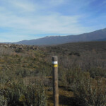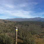 Caminamos por una cómoda pista, de vez en cuando vemos algún poste de señalización con marcas de pintura blanca y amarilla de los caminos ya indicados. La pista comienza a descender y tenemos una magnifica visión de los montes que rodean esta parte de la sierra.