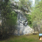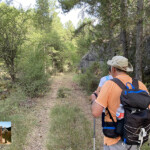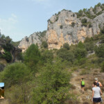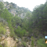 El sendero sigue, cruza de nuevo otro barranco y durante un centenar de metros pasa por en terreno desnudo de vegetación hasta que de nuevo cruza oro barranco y se interna en el bosque de pinos. La senda nos saca en un ascenso a una pista principal y justo enfrente tenemos un interesante panel sobre la vida en los cortados, en la que habitan el buitre leonado, la corneja común, la chova piquirroja y el avión roquero, entre otros animales.