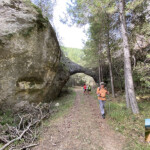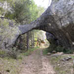 Continuamos por la pista hasta llegar al fondo de la rambla del Arco donde giramos a la izquierda para continuar por ella. Poco después el camino se angosta y caminamos por estrechos callejones de altas paredes para llegar al fenómeno natural de arco de piedra. bien merece una foto y un rato contemplándolo. Aquí podemos darnos cuenta de la labor del agua y de los elementos naturales que han ido tallando poco a poco esta piedra.